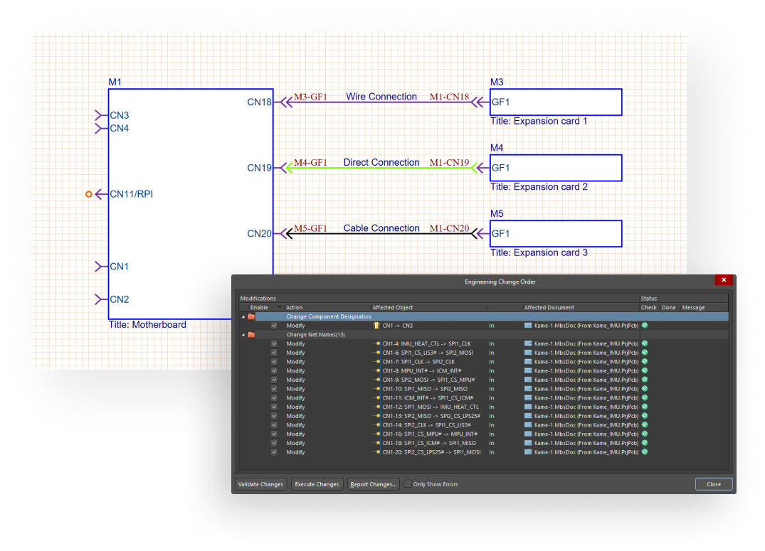 Ensure that you maintain proper connection parity among all projects and eliminate potential errors with the Connection Manager. This tool displays board interconnections pin-by-pin and offers resolutions to any pin conflicts, and changes can be transferred with an ECO to individual PCBs.