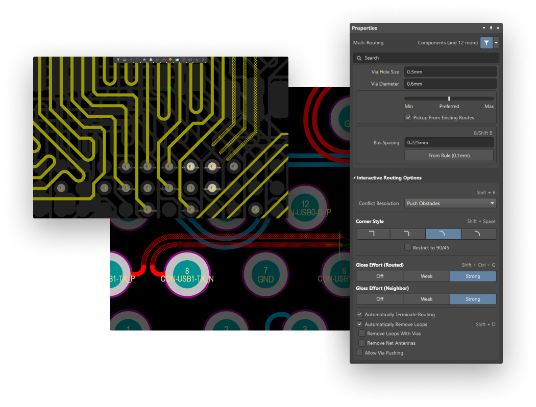 Easily manage tight board clearances, minimize track lengths, and reduce crosstalk by routing at any angle. Altium Designer gives you the freedom to effortlessly switch cornering topologies, whether that’s 45°, 90°, rounded corners, or Snake Routing with smooth obstacle avoidance.